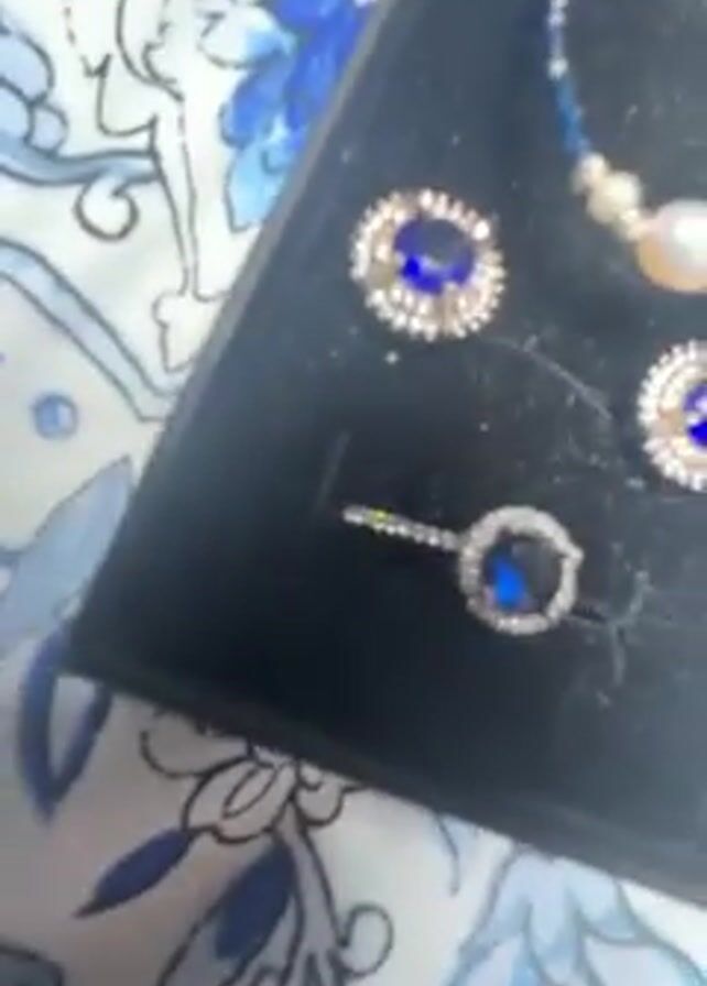 black jewelry box being opened to reveal a matching set of jewelry on top of a fabric with a blue and white floral pattern. The set includes a ring, a pair of earrings, and a necklace. Each piece features a dark blue center stone surrounded by smaller, clear stones. The necklace also contains three white pearls. The box is presented in the center of the frame, with the fabric forming the backdrop.