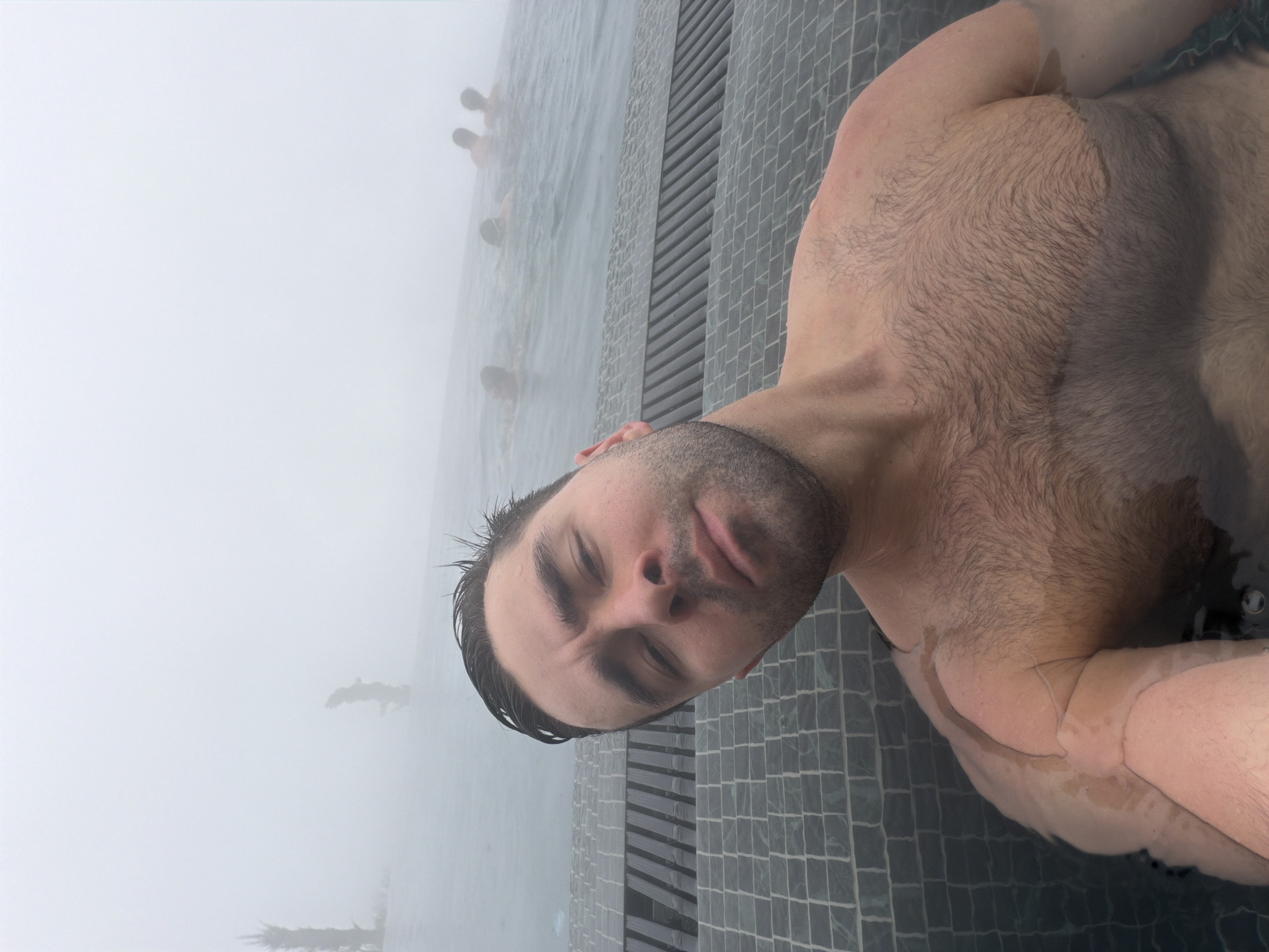 A man is in a pool that is at an outdoor facility in Tbilisi, Georgia. The pool is surrounded by fog. There are other people in the background. The man has dark hair and a beard and is wet. The pool has tile and a metal barrier.