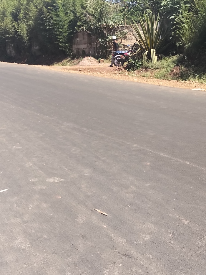 The image captures an outdoor scene in Nyansiongo ward, Kenya, featuring a paved road and a vegetated roadside