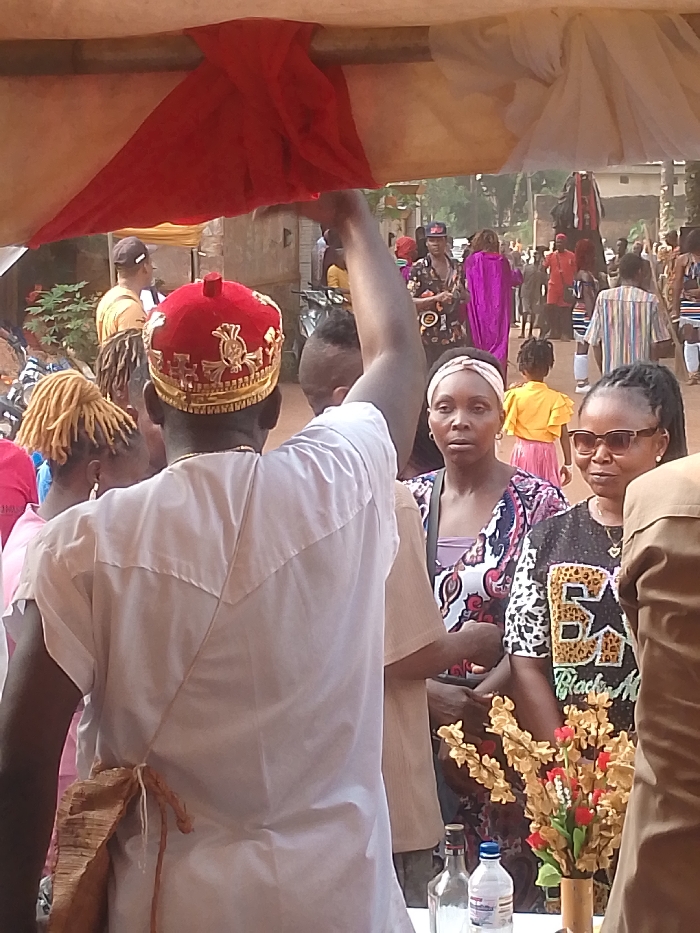 An outdoor gathering is depicted in Nnobi, Nigeria, beneath a temporary canopy constructed with red and white fabric. In the immediate foreground, a man, observed from behind, wears a white short-sleeved shirt and a red velvet cap with ornate gold embroidery. His right arm is elevated vertically. A light brown, woven shoulder bag hangs across his left side. To the right of this man, a woman with blonde dreadlocks is partially visible. Further to the right, two women are present; one wears a multicolored patterned top and a light-colored headband, looking directly forward. The second woman, adjacent to her, wears a black top featuring a 'Black AF' star design and sunglasses, orienting her gaze to her right. On a surface in the lower right, a small cluster of artificial yellow and red flowers in a brown container, an empty clear glass bottle, and a plastic water bottle are visible. The midground and background are populated by numerous individuals, including a person in a prominent purple garment, a small child in a yellow top and pink skirt, and a tall, dark, figure-like structure in the distant background. The surrounding environment includes blurred residential structures and green foliage.