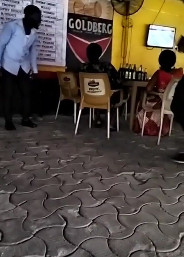 n outdoor bar area with a concrete tiled floor. A price list for Diamond Bar is displayed on the wall. Two men are standing near the price list, seemingly looking at it. Another two people are seated at a table, along with several bottles of beer. A Goldberg beer advertisement is also visible on the wall. The bar is brightly lit, with a yellow painted wall.