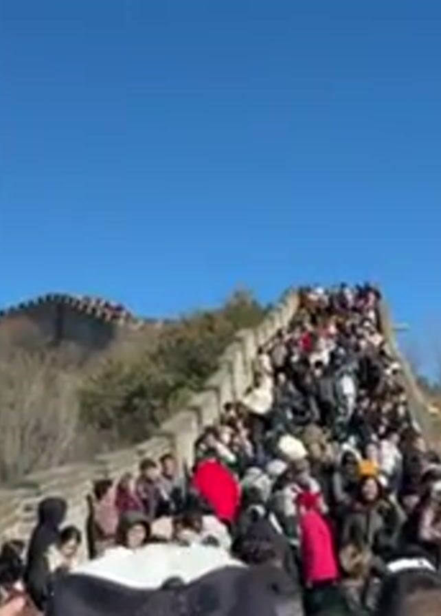 large crowd of people ascending a steep section of the Great Wall of China on a sunny day with a clear blue sky