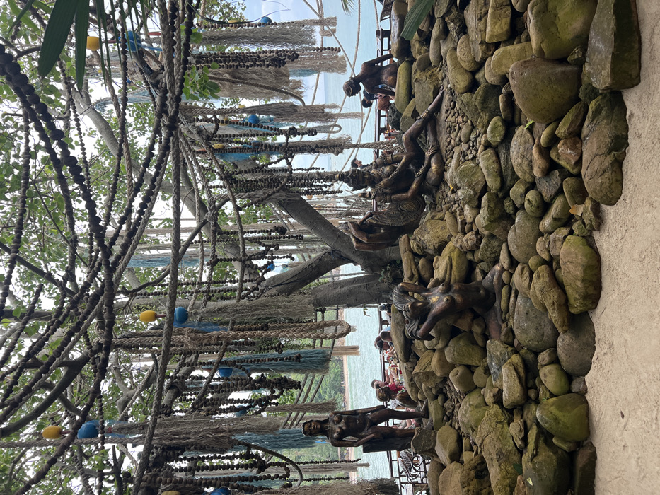 The scene depicts an outdoor dining or lounge area in Baan Sri Thanu, Thailand, situated beside a body of water. In the foreground, a sandy area transitions into an arrangement of natural, moss-covered rocks of various sizes. Integrated among these rocks are four bronze-colored statues: one standing female figure facing right, one crouching female figure with raised arms, one reclining figure in a traditional ornate pose, and one seated female figure facing away towards the water. Above these elements, a large tree with multiple trunks and dense foliage forms a canopy. Its branches are extensively decorated with numerous hanging elements, including long strands of braided rope, strands of dark bead-like objects, bundles of light-colored fibrous material, strips of blue fabric, and interspersed yellow and blue spherical floats. Behind the rock and statue arrangement, a raised wooden platform hosts several tables and chairs. Multiple individuals are seated at these tables, some engaged in eating or conversation. Beyond the platform, a calm, turquoise-blue sea extends to the horizon. A distant green coastline is visible on the left side of the water. The sky overhead is overcast or hazy white.