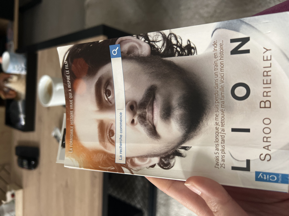 A close-up photograph depicts a left hand holding an open paperback book, positioned indoors in Mundolsheim, France. The book's cover features a headshot of a man with dark, curly hair and a mustache, appearing to be Dev Patel. A white horizontal search bar graphic with a magnifying glass icon is overlaid across his eyes, containing the French text "La recherche commence" (The search begins). Above this, the text reads "LA FORMIDABLE HISTOIRE VRAIE QUI A INSPIRÉ LE FILM" (The formidable true story that inspired the film). Below the search bar, additional text states, "J'avais 5 ans lorsque je me suis perdu dans un train, en Inde. 25 ans plus tard j'ai retrouvé ma famille. Voici mon histoire..." (I was 5 years old when I got lost on a train in India. 25 years later I found my family. Here is my story...). The book's title, "LION," is prominently displayed beneath this text, followed by the author's name, "Saroo Brierley." The publisher's imprint, "City Poche," is visible on the book's lower left spine. The background is blurred, showing a light-colored wooden table surface. On the table, a white mug filled with a light brown liquid (likely coffee or tea) is visible to the right of the book. Further back on the table, a black electronic device and a black rectangular tray or container are discernible.