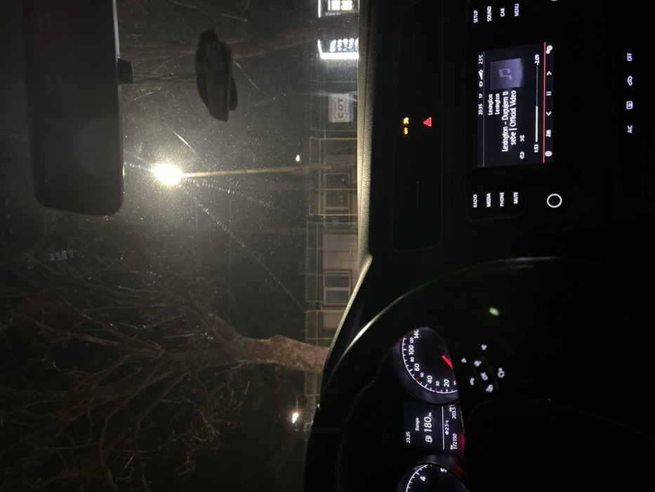 The image depicts the interior of a stationary vehicle at night, looking forward through a wet or dirty windshield