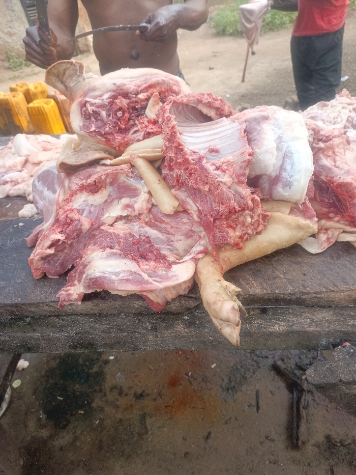 A raw butchered pig lies on a weathered, likely wooden, surface. The pig's head is visible, revealing its exposed skull and meat. A section of ribs is clearly visible. The animal's leg is present, showing the pig's hoof. A man in the background holds a knife, possibly involved in the butchering. A man in a red shirt is standing in the background. Yellow jerrycans are partially visible in the background. The surface beneath the pig is dirty and stained.
