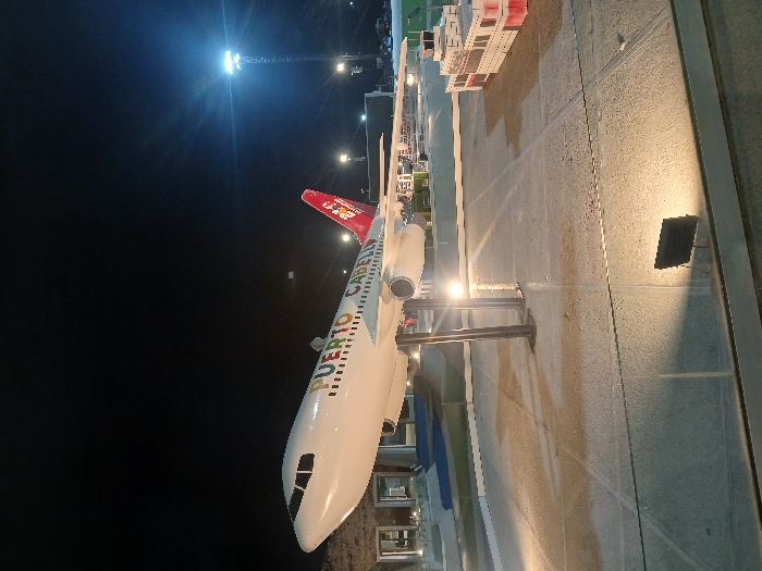 A white airplane bearing "PUERTO CABELLO" lettering is mounted on a black stand against a backdrop of dark sky and bright lights