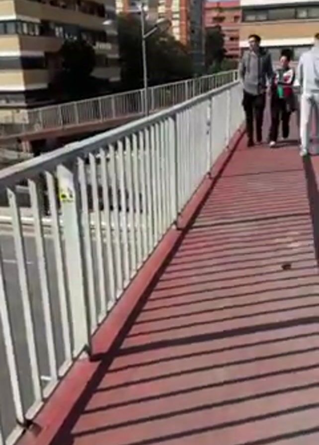 view of a city street from a pedestrian bridge. The road below has multiple lanes of traffic moving in both directions, with cars, motorcycles, and buses visible. Buildings line both sides of the street, and there are parked cars along the sidewalks. The sky is clear and blue. The pedestrian bridge has white railings. A person wearing a gray sweatshirt walks across the bridge.