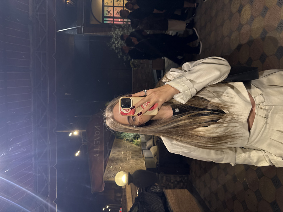 A young woman is depicted taking a selfie reflected in a glass surface at night. She has long, straight blonde or light brown hair and is wearing clear-rimmed glasses, a light-colored cropped blazer over a black top, and matching pleated trousers. A silver flower-shaped pendant necklace is visible. Her left hand, adorned with dark red fingernail polish and a ring on the ring finger, holds a light-colored smartphone with a red-and-white patterned case, obscuring her face. In the reflected background to the left, a dark-colored vehicle is parked on a street. Beyond it, an outdoor seating area with dark upholstered furniture is partially visible behind a decorative screen. A spherical illuminated lamp on a dark pedestal stands between the woman and the outdoor seating. An awning displaying the reversed text "NOVELLA" is prominent above the seating area. Further in the background, streetlights illuminate a distant road. To the right of the woman, beyond the reflection, a group of approximately five to seven individuals, mostly men dressed in dark attire, are standing or walking. They appear to be gathered near a building entrance featuring a window or panel with a multicolored, possibly stained-glass or patterned design. The scene takes place outdoors at night. The location is identified as an establishment named Novella, based on the reversed text on the awning, likely "Novella Garden" or a similar restaurant/cafe, situated in the city of Yerevan, Armenia.