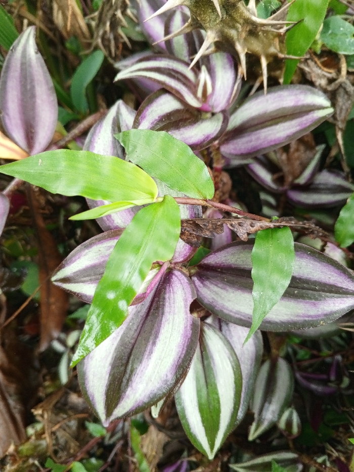A close-up shot showcases purple and silver striped leaves of a Tradescantia zebrina, commonly known as Wandering Jew. Several vibrant green leaves with prominent veins intertwine amidst the striped foliage. A thorny stem with sharp spines looms in the upper portion of the scene. The composition is set against a natural backdrop of soil and other plant matter, suggesting an outdoor setting.