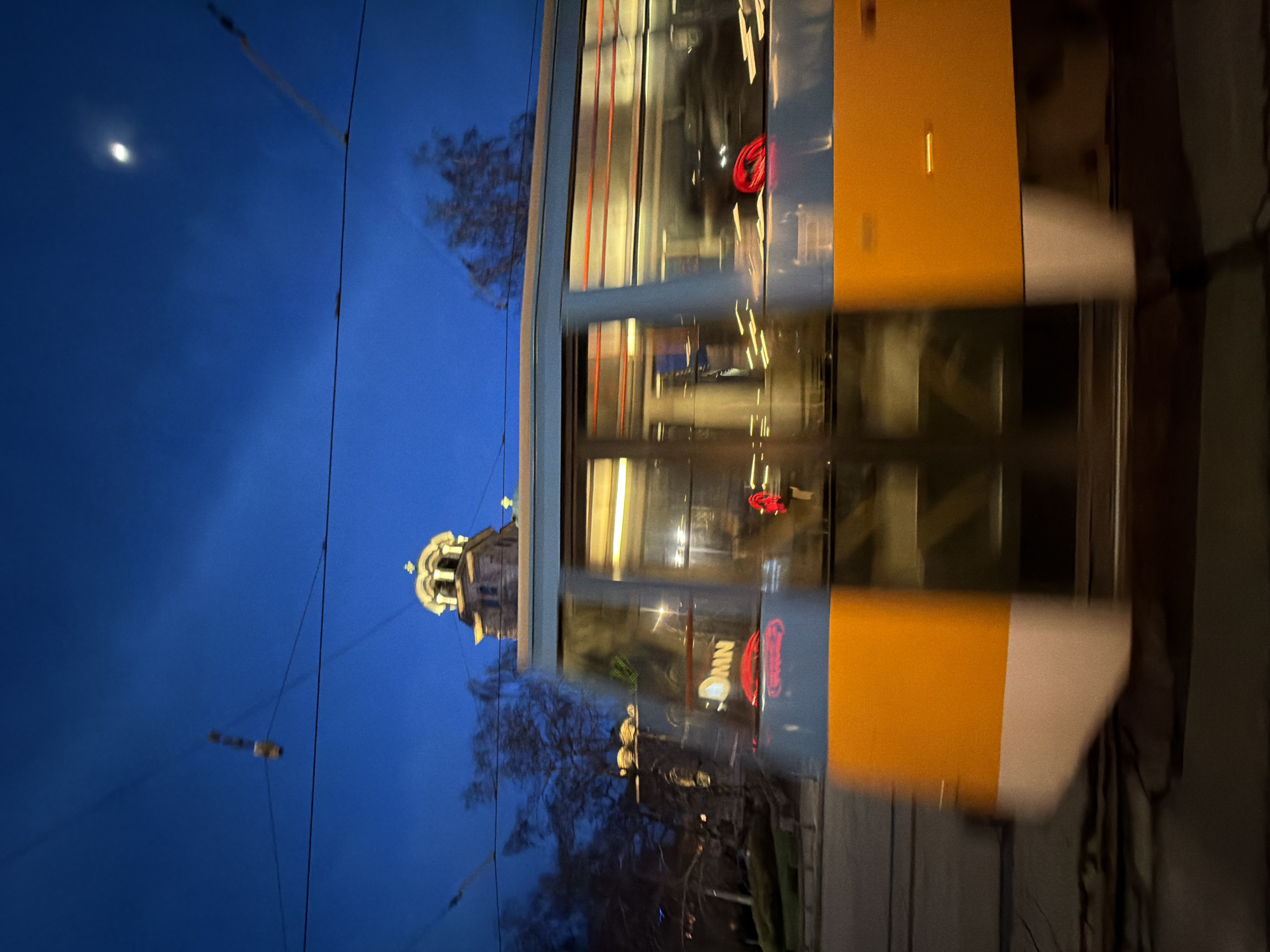 blurred scene captured from a moving tram in Sofia, Bulgaria. The sky is dark blue with the moon visible. Wires from the tram system are prominent in the foreground. The reflection in the tram window shows the illuminated St. Nedelya Church. The tram is yellow and white. A neon sign reflecting in the window says "MIN". Bare trees are also visible.