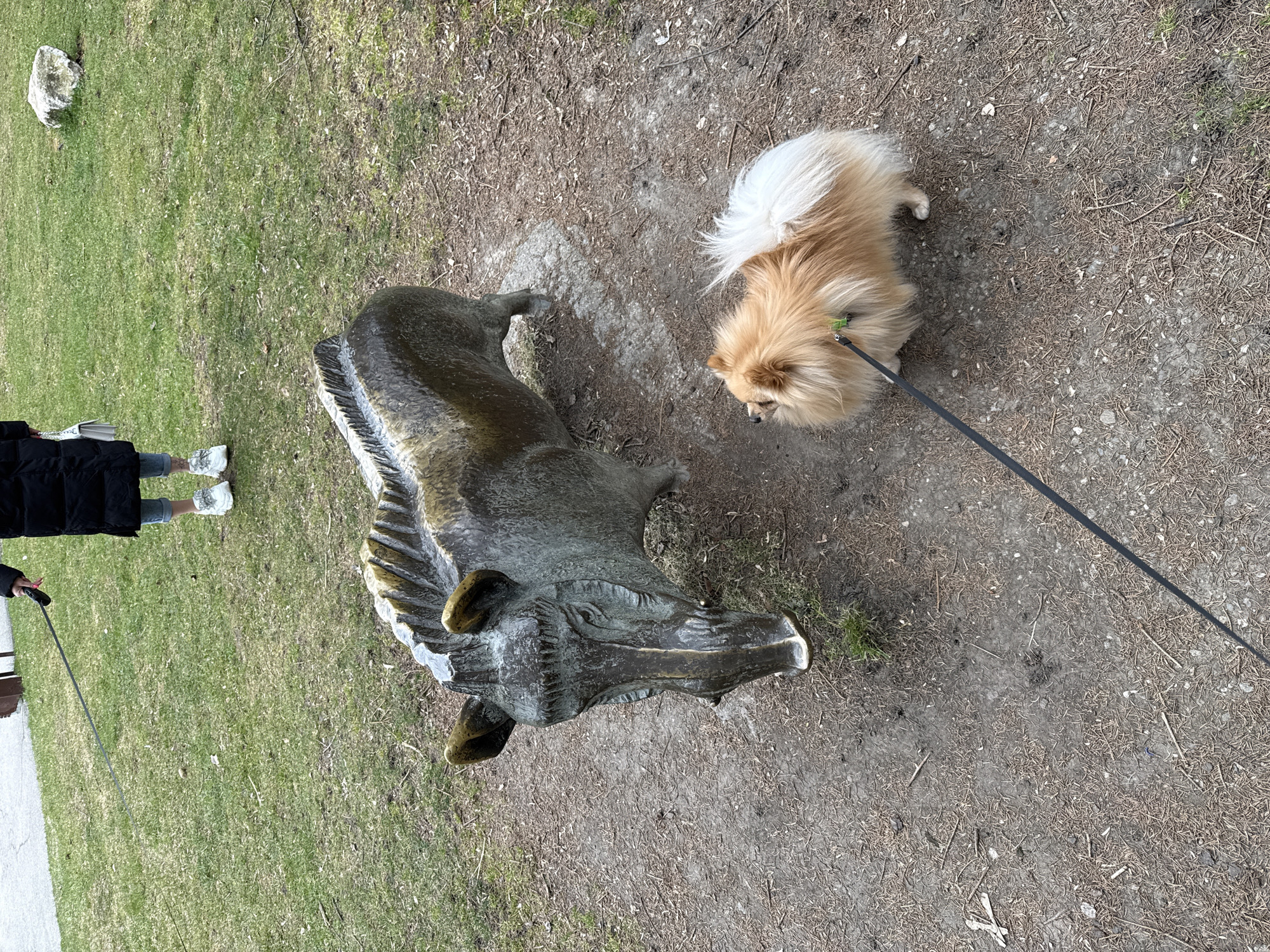 This image captures an outdoor scene in a park or public green space within the city of Razlog, Bulgaria. The primary subjects include a partially visible person, a bronze warthog statue, and a Pomeranian dog. In the upper portion of the frame, the lower body of an individual is visible, wearing a long black puffer coat, light blue rolled-up jeans, and white chunky sneakers. A white handbag with a silver chain strap hangs from their left side. Their right hand holds a black dog leash. A weathered bronze statue of a warthog occupies the mid-left, facing towards the lower left. The statue exhibits a greenish patina with golden accents on its ears and tusks, and stands on a low, partially obscured concrete base. In the lower right, a small Pomeranian dog with a fluffy cream and light brown coat, featuring white fur on its tail and hindquarters, stands on a dirt path. It is wearing a lime green harness, from which the black leash extends upwards towards the person. The dog is looking towards the upper left, away from the camera. The ground surface is divided, with a dirt path covered in pine needles and small twigs in the foreground and around the statue, transitioning to a patch of sparse green grass in the upper half of the image. A small, light-colored rock is visible on the grass in the upper right. Natural daylight illuminates the scene.