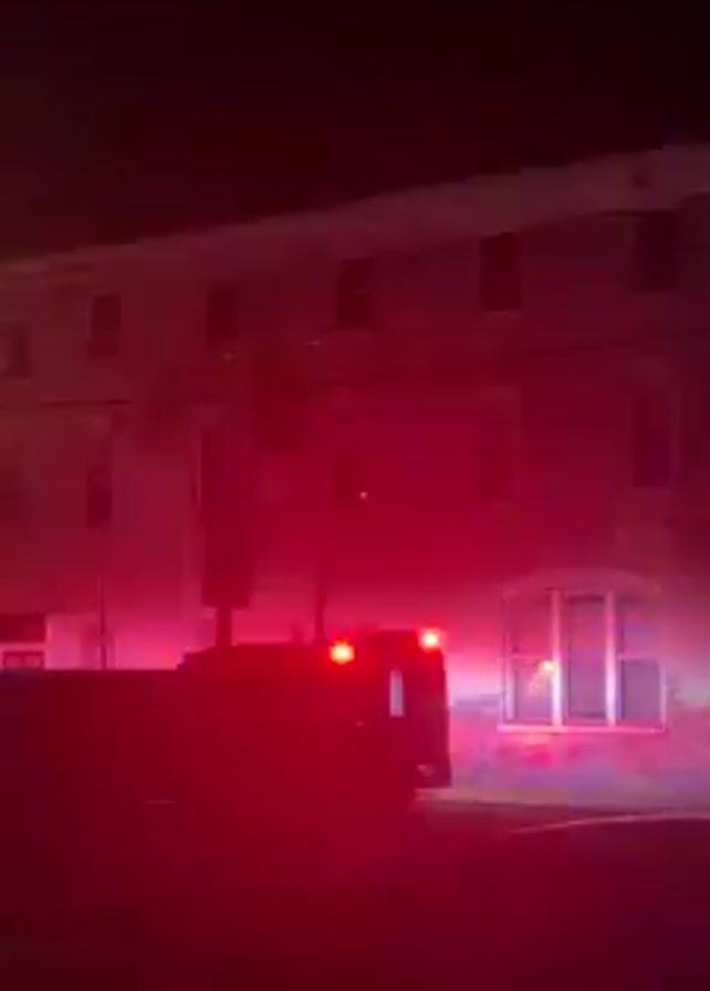 At night, a fire truck sits on a dark street. The truck’s emergency lights cast red and blue light onto the building it faces. The building has windows and appears to be three stories tall. The truck is situated in front of the building. A silver car is parked in the foreground to the right.