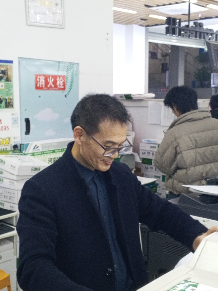 The image captures an indoor scene in what appears to be an office or print shop in Jiangjin, China