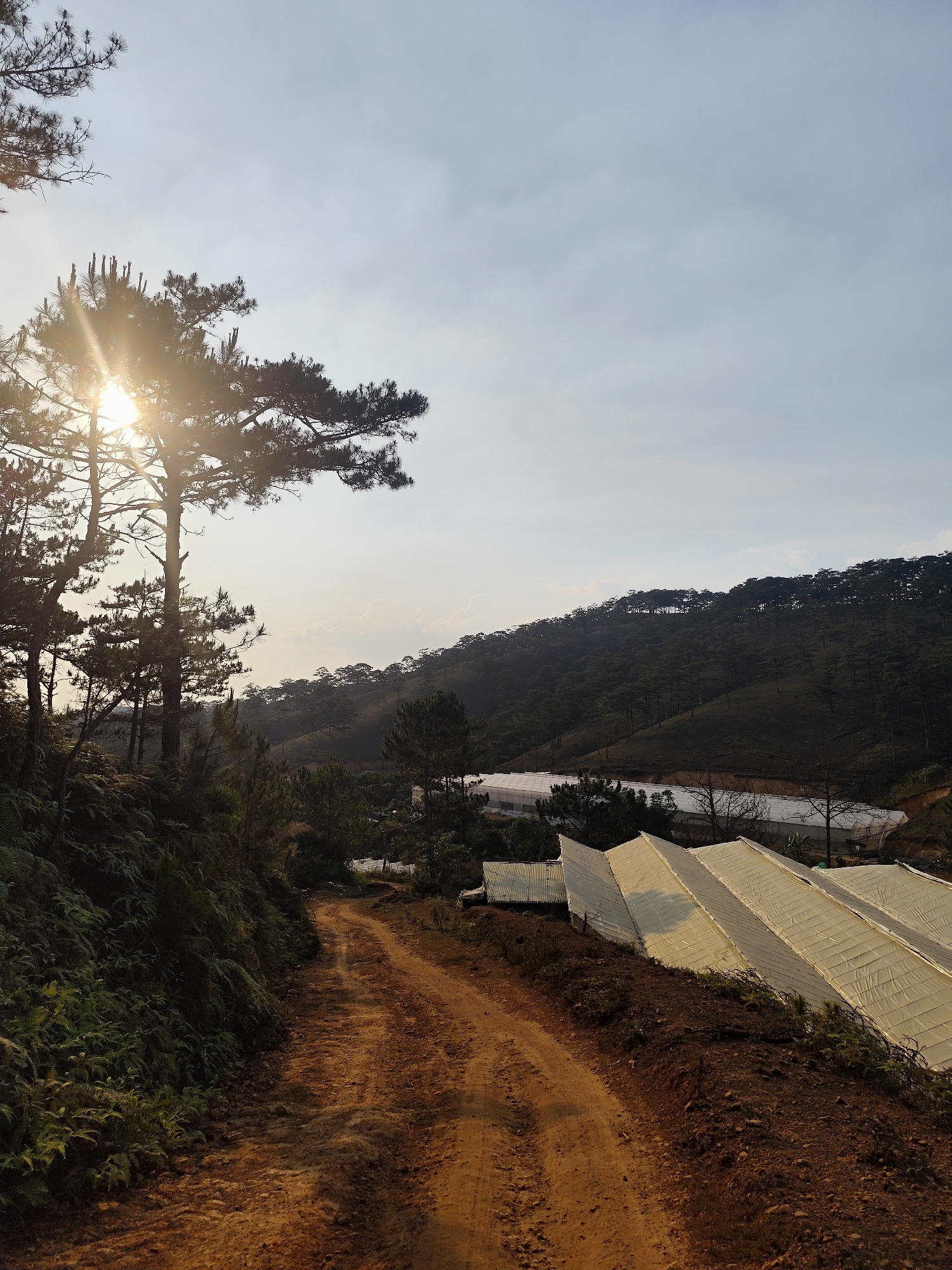 The scene depicts a rural landscape in Lạc Dương, Vietnam. A reddish-brown dirt road, showing uneven terrain and minor ruts, curves from the lower-center towards the mid-right. To the left of the road, an embankment is densely covered with green ferns and other undergrowth. Several tall pine trees, silhouetted against a bright, hazy sky, dominate the left side of the frame; a prominent sun flare is visible through the branches of a large pine tree in the upper-left quadrant. In the mid-distance, numerous white, tarp-covered agricultural greenhouses are arranged on a sloping terrain to the right of the road. Further in the background, a large hill covered by a dense, uniform pine forest rises against the horizon. The sky is a light blue, transitioning to white with faint clouds. No people or animals are present.
