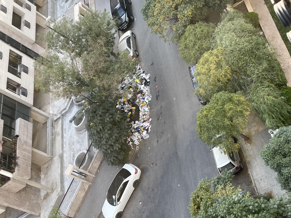 The image depicts an urban street scene in Kafr Sousa Municipality, Syria, observed from a high vantage point overlooking the street and adjacent residential buildings. The scene is dominated by a street with multiple parked vehicles and a substantial accumulation of refuse. In the upper portion of the frame, multi-story residential buildings with light-colored concrete facades, numerous windows, and balconies are visible. Some balconies feature small planters with vegetation. The architecture includes visible support columns and recessed areas. The street, paved with asphalt, curves slightly through the center of the image. Parked vehicles are present on both sides of the street. On the left, a white Mercedes-Benz CLS-Class sedan with a black panoramic roof and black wheels is parked, facing away from the viewer. On the right, a silver sedan and a black SUV are parked sequentially, also facing away. A lighter-colored vehicle is partially visible further down the street on the left, mostly obscured by trees. Centrally located on the right side of the street, at the base of a dense green bush and partially extending onto the asphalt, is a large, irregularly shaped pile of assorted garbage. This refuse consists of numerous plastic bags (white, clear, and various colors), plastic bottles, cardboard, and other indistinguishable household waste items. Trees and dense green bushes line the street and are planted in dedicated green spaces and along sidewalks. No individuals are visible in the scene, and no active interactions or movements are observed. The environment appears static under daylight conditions.