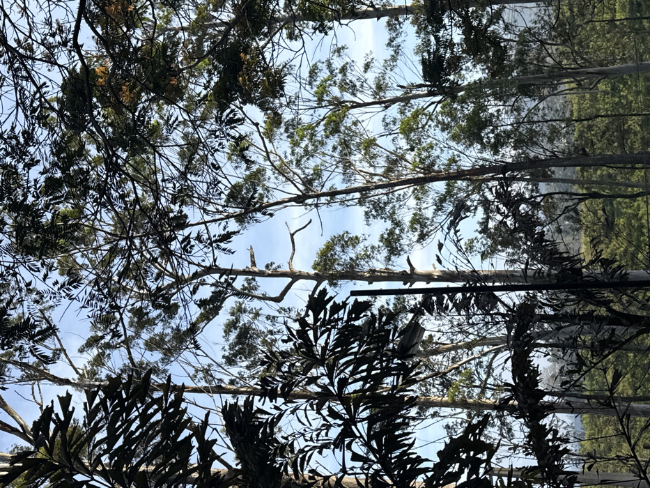Looking upwards through trees with leafy and fern-like foliage, a blue sky peeks through the canopy