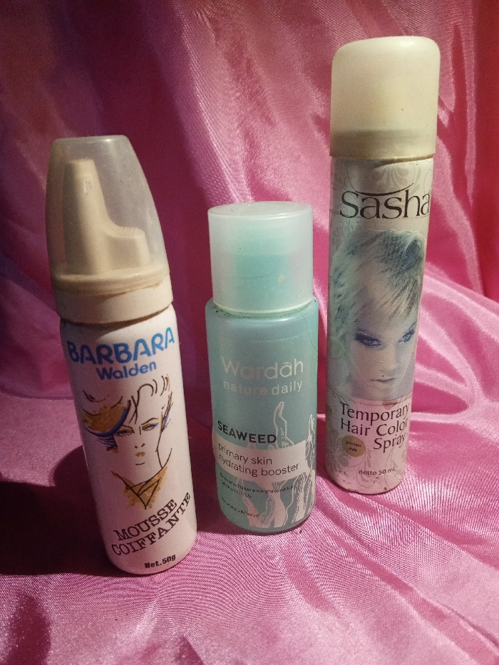 Three skincare and hair products sit on a pink fabric surface. On the left, "Barbara Walden Mousse Coiffante" features a woman's face illustration. In the center, a blue-toned "Wardah Nature Daily Seaweed Hydrating Booster" bottle stands. To the right, a "Sasha Temporary Hair Color Spray" can displays a woman's face and details the spray's purpose. The product names are prominently displayed, and sizes are labeled.