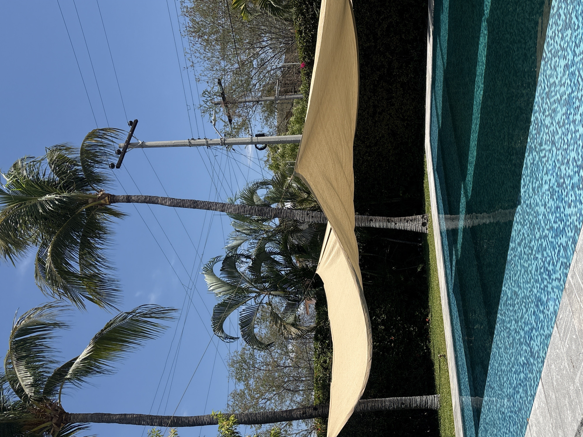 A poolside scene is presented under a clear, blue sky, featuring the city of Puerto Escondido, Mexico. Several palm trees, identifiable by their tall trunks and characteristic foliage, are present. Power lines traverse the sky. An off-white, curved canopy partially obstructs the view, suggesting it is providing shade. A pool borders the scene, its water appearing blue, green, and patterned from the reflections, with what may be tile patterns. Lush greenery and vegetation are visible, adding to the outdoor setting.