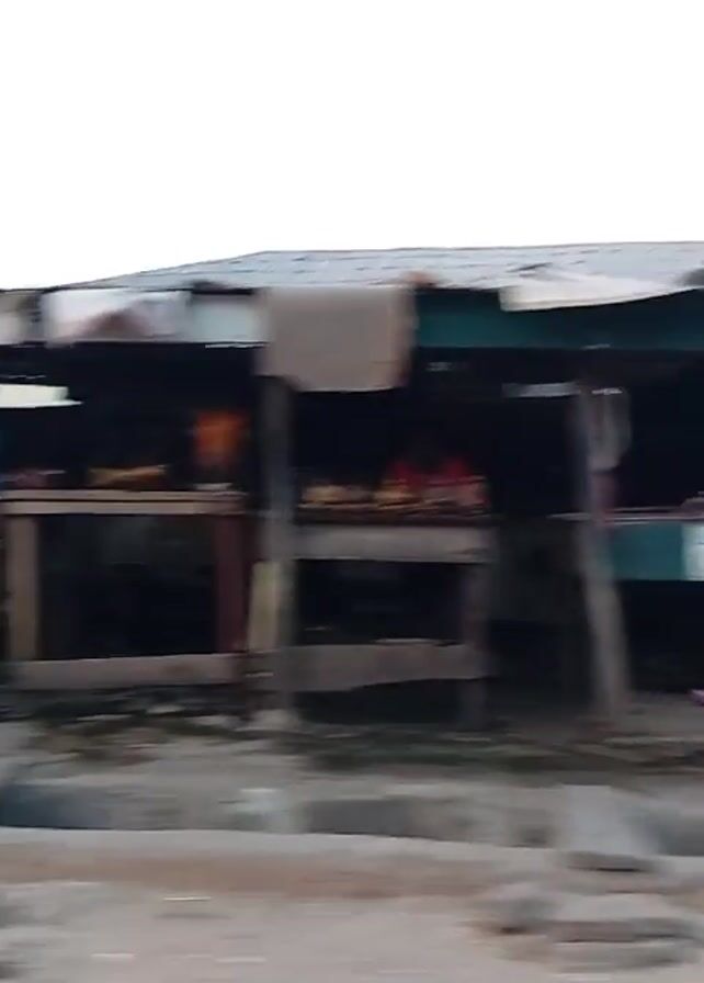 roadside scene with people walking and standing in front of a covered structure that appears to be a food stall or market