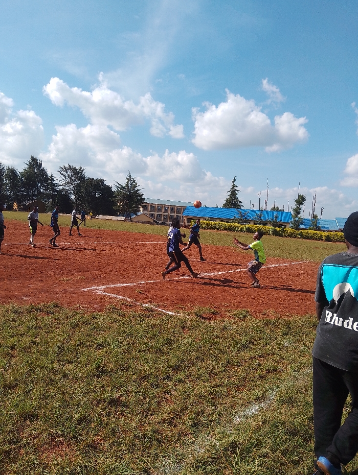 group of young men playing a game of soccer on a dusty field in Rungiri, Kenya. The field is surrounded by a green grass perimeter and a row of trees and a building in the background. The sky is blue with white clouds. The men are wearing a variety of clothing, including blue jerseys and shorts, green jerseys and shorts, and one man is wearing a black long-sleeved shirt with a blue logo on it. The men are running and kicking a soccer ball towards a goal that is not visible in the image. The ball is in the air, and there is a white chalk line on the ground marking the edge of the field. One of the players is wearing a black shirt with a blue and white "Rhode" logo. There is another player wearing a blue jersey with a white shirt underneath. The image is taken from a slightly elevated viewpoint, looking down at the field.