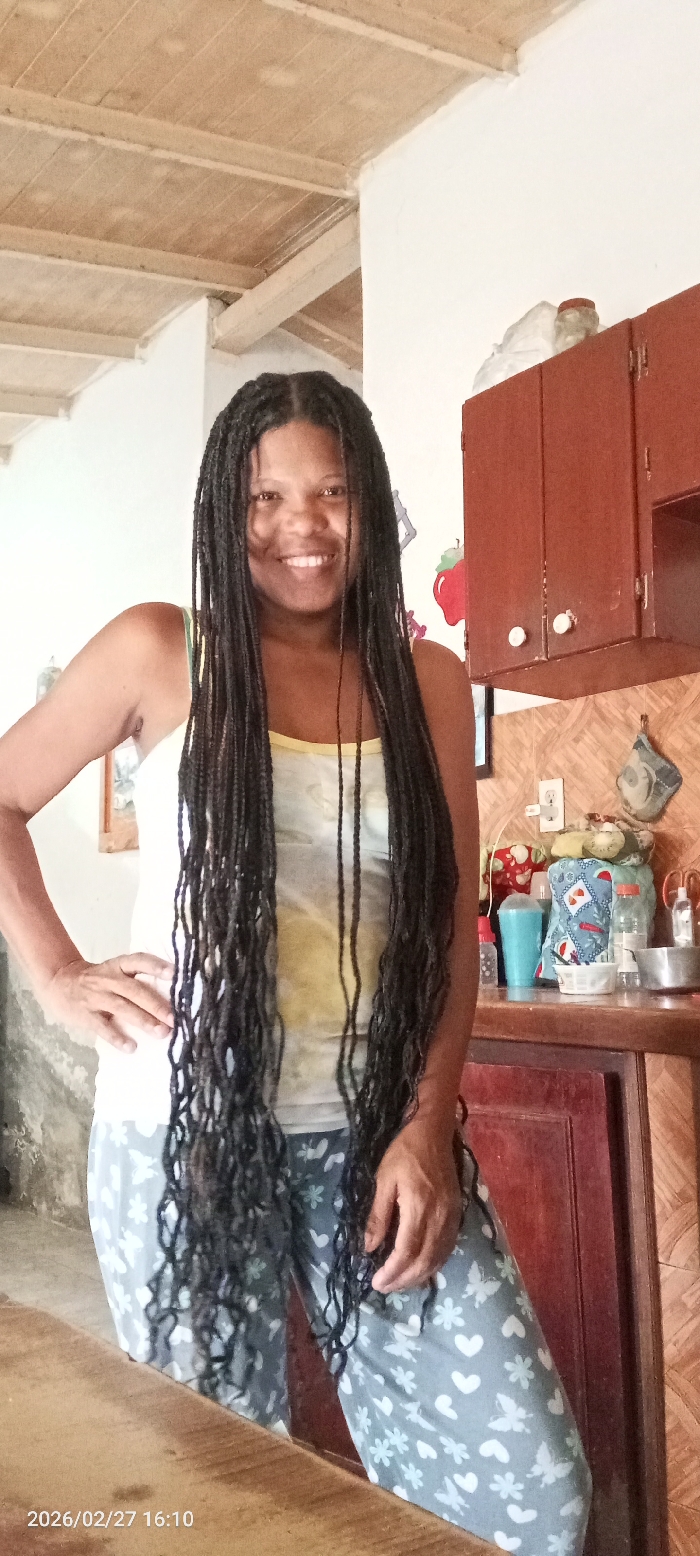 The image displays a female subject standing indoors, in what appears to be a residential kitchen or utility area within the city of Altagracia, Venezuela. The subject is a dark-skinned individual with long, dark box braids extending to mid-thigh level. She is wearing a light-colored tank top and gray pants patterned with white hearts, butterflies, and flowers. Her left hand rests on her hip, and she is smiling while looking directly at the viewer. The background on the left features a light-colored wall with a framed object and a wooden ceiling composed of light-toned planks or beams. The background on the right reveals a kitchen section with dark reddish-brown upper cabinets equipped with white circular knobs. Below the cabinets, a countertop, possibly of wood or tile with a light pattern, holds various items: a white bag, a glass jar, a blue plastic cup, multiple clear plastic bottles, and a metal bowl. A light-colored patterned backsplash and a white electrical outlet are visible behind the countertop. Wall decorations, including a red fruit motif and a blue and white patterned fabric item, are affixed to the wall. A wooden surface is present in the lower foreground. The timestamp "2026/02/27 16:10" is embedded in the bottom left corner of the image.