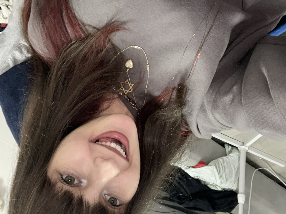 A woman with dark brown hair and reddish highlights smiles at the camera. She is wearing a gray sweater and two gold necklaces: one with a Star of David and another with a heart. Her eyes are hazel, and she has bangs. The background is cluttered with bedding and a white metal rack. The image appears to be taken from a slightly low angle, and the phone is slightly slanted.
