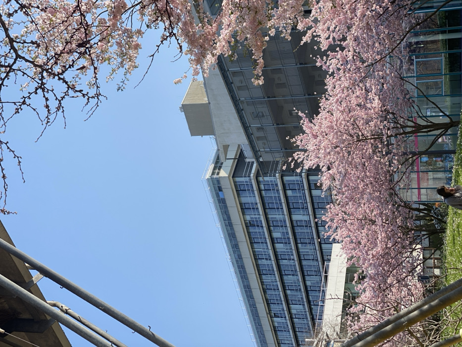 The image displays a clear spring day scene on the Neuenheimer Feld campus of Heidelberg University, Germany. A bright, unblemished blue sky occupies the upper portion of the frame. In the upper left quadrant, grey structural elements, comprising angled metal supports and a concrete beam from an overhead walkway or bridge, are visible. The midground features a vibrant landscape dominated by multiple cherry blossom trees, their branches densely covered in pink flowers, indicating full bloom. Beneath the trees, a patch of green grass is visible, interspersed with small white flowers. A single individual, with dark hair, is seated on the grass in the lower-center, wearing a dark top and looking down at an object held in their hands. In the background, two distinct modern buildings are present: a multi-story structure on the left characterized by numerous horizontal rows of windows and light-colored panels, and to its right, a grey, multi-story building with a more utilitarian appearance, possibly featuring horizontal grilles or slats. Portions of a lower building with reflective glass and red signage are visible through the cherry trees.