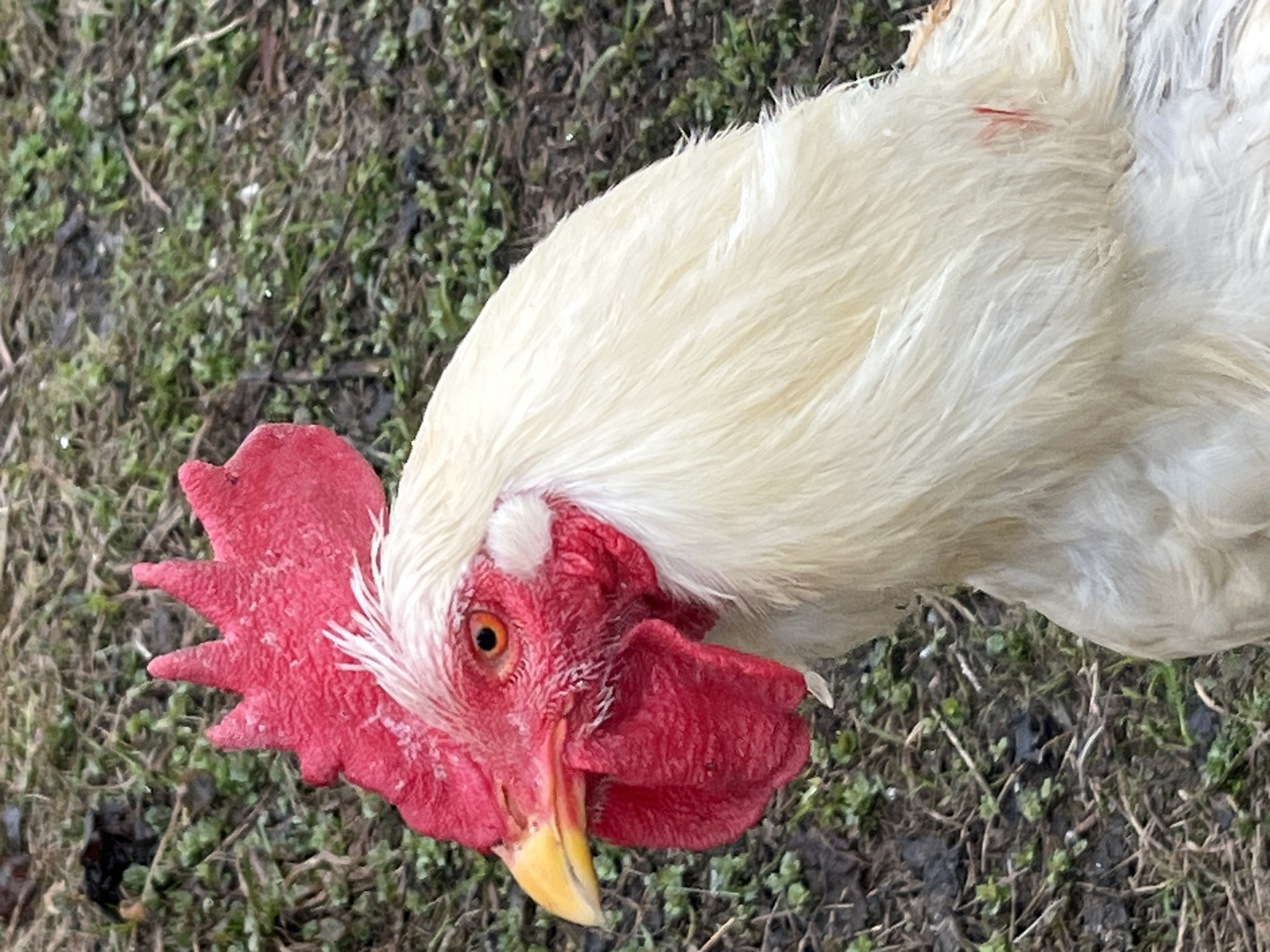 - "close-up, high-angle shot of a white rooster in an outdoor setting" by FM-uf9rE3, licensed under CC BY 4.0