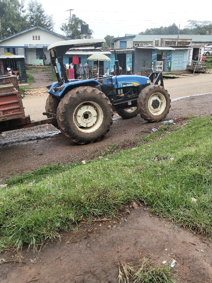 The image depicts a roadside scene in Nyansiongo ward, Kenya, under an overcast sky. A blue New Holland tractor, its large tires caked with mud and featuring white rims, is parked on a reddish-brown dirt shoulder, facing right. It is hitched to a rusty, open-topped red metal trailer. In the background, a light blue building with a partial sign reading "GUSII WATER SANITATION & E..." stands to the left, with an elevated black water tank behind it. Adjacent to this, a line of single-story commercial structures, some painted light blue and others corrugated metal, border a dirt path next to an asphalt road. One stall displays various items of clothing under an open green patio umbrella. Several indistinct individuals are visible in the background among these shops. The immediate foreground features a strip of green grass and weeds on a slightly elevated bank, with damp reddish-brown dirt and scattered debris at its base. The asphalt road curves out of frame to the right.