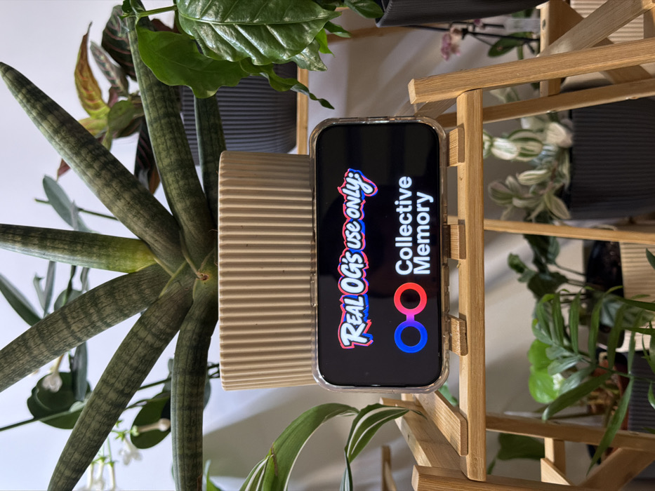 The scene is an indoor environment in the city of Priseltsi, Bulgaria, featuring a collection of potted plants on and around a wooden stand. In the foreground, a smartphone encased in a clear protective cover is oriented horizontally, resting on the second tier of a light-colored wooden multi-tiered plant stand. The phone screen displays text and a logo on a black background; "REAL OG's use ONLY:" is prominently featured in a stylized, colorful font with a blue and red gradient. Below this, a logo of two overlapping circles, one blue and one red, precedes the white text "Collective Memory." Directly behind the smartphone, a Sansevieria plant with tall, cylindrical, striped green leaves is potted in a beige, vertically ribbed, cylindrical planter. Several other potted plants are visible throughout the image: a plant with variegated white and green leaves is partially visible to the left of the Sansevieria; a plant with reddish-green variegated leaves is in a dark gray ribbed pot to the right; and various other green foliage plants, including one with large dark green leaves and another with white-striped leaves in a dark grey pot, populate the lower tiers of the wooden stand and the background against a plain white wall. A small white flower is visible towards the top left, emerging from a plant not fully in frame. No people are present.