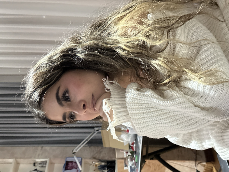 A young woman with long, highlighted hair and full eyelashes rests her chin on her hand. She's wearing a white knit sweater with a frayed collar. Her gaze is directed downwards and slightly to the left. The background is a cluttered workspace with a desk lamp, various tools, and supplies. The image is rotated, giving the impression that the scene is tilted.