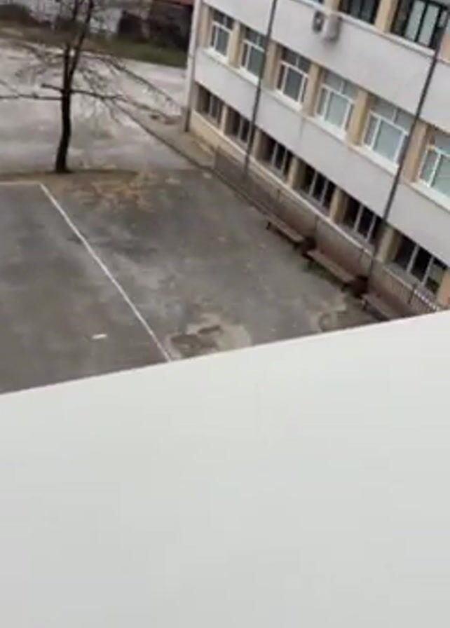 n overcast day with a view from an elevated position overlooking a school building and a basketball court. The school building is a multi-story structure with many windows. A basketball court is visible below. In the background, there is a town or village nestled among forested hills or mountains. The sky is gray, indicating cloudy weather.