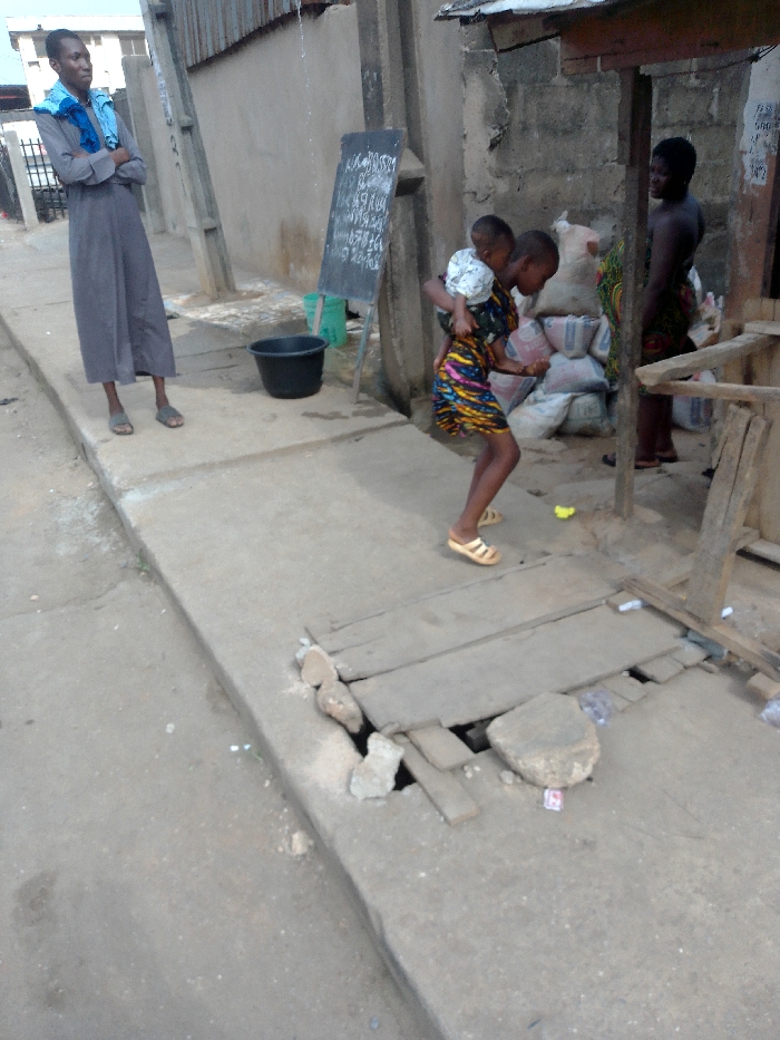 A woman carries a child across a dangerous section of sidewalk with missing and broken concrete. Another woman stands nearby watching with her arms crossed. In the background, another person stands in the entrance of a shop. A chalkboard with writing is visible to the left. A black bucket is placed on the sidewalk. The scene appears to be in a low-income, urban area.