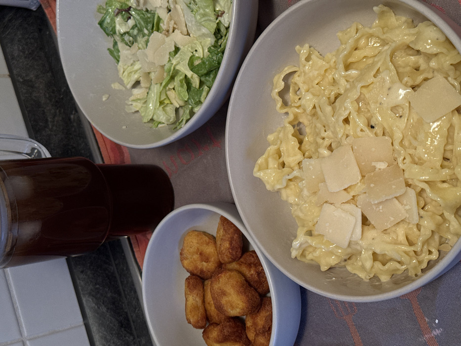 A high-angle shot showcases a meal laid out on a grey surface. A bowl of caesar salad with lettuce and cheese is adjacent to a bowl of creamy pasta topped with square cheese slices. A smaller bowl holds fried, bite-sized nuggets. A glass bottle containing a dark liquid sits next to the food. The entire scene is bathed in soft light.