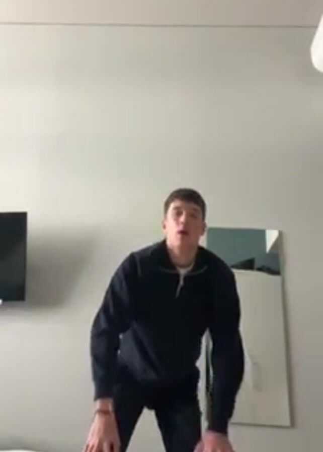 A young man in a dark blue, zip-up sweater and dark pants is standing on a bed. He is breathing heavily and looks straight ahead. Behind him is a white wall, a television on a stand, and a white cabinet with a mirror on the door. The room is well-lit. The man appears to have just finished some sort of physical activity.