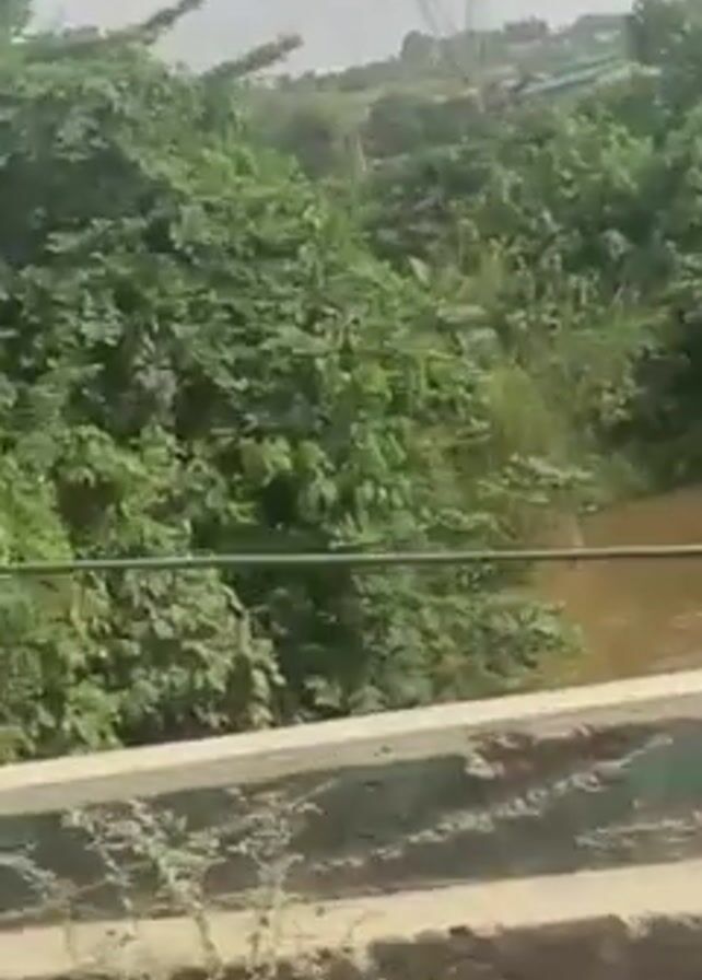 The video, taken from inside a moving vehicle, shows a landscape with a small river or stream flowing under a bridge. The water is muddy and high, suggesting recent rainfall. The bridge appears to be concrete and has a metal railing. Lush green vegetation covers the banks of the river and extends into the background. The sky is overcast. The vehicle is moving along a dirt road, with a concrete curb visible on the side.