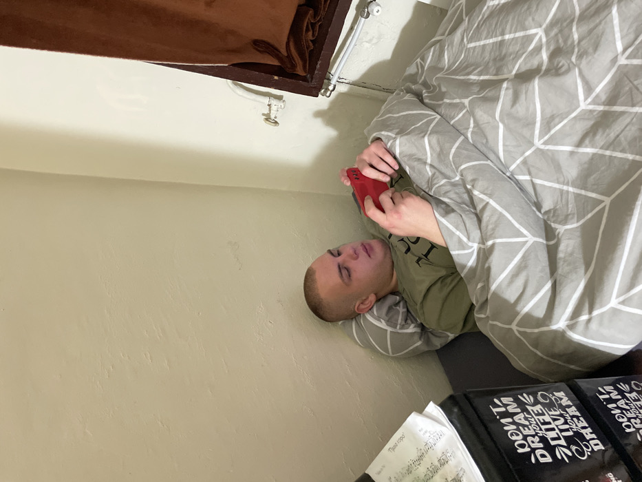 A male individual is depicted lying in bed within a room in Kotel, Bulgaria. He has short, buzzed hair and wears an olive-green t-shirt. He holds a red-cased smartphone horizontally with both hands, viewing its screen. He rests against a grey pillow and is covered by a grey duvet, both featuring a white geometric pattern. To his left, a dark-colored multi-level storage unit displays the text "DON'T DREAM YOUR LIFE LIVE YOUR DREAM." A stack of sheet music rests on this unit. The walls are light beige and textured. To the right, exposed white pipes and a valve are visible on the wall, alongside a dark brown framed opening with a brown curtain or fabric.