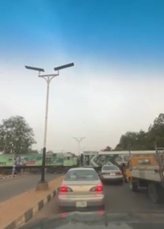 street scene with a train crossing the road, causing traffic to stop
