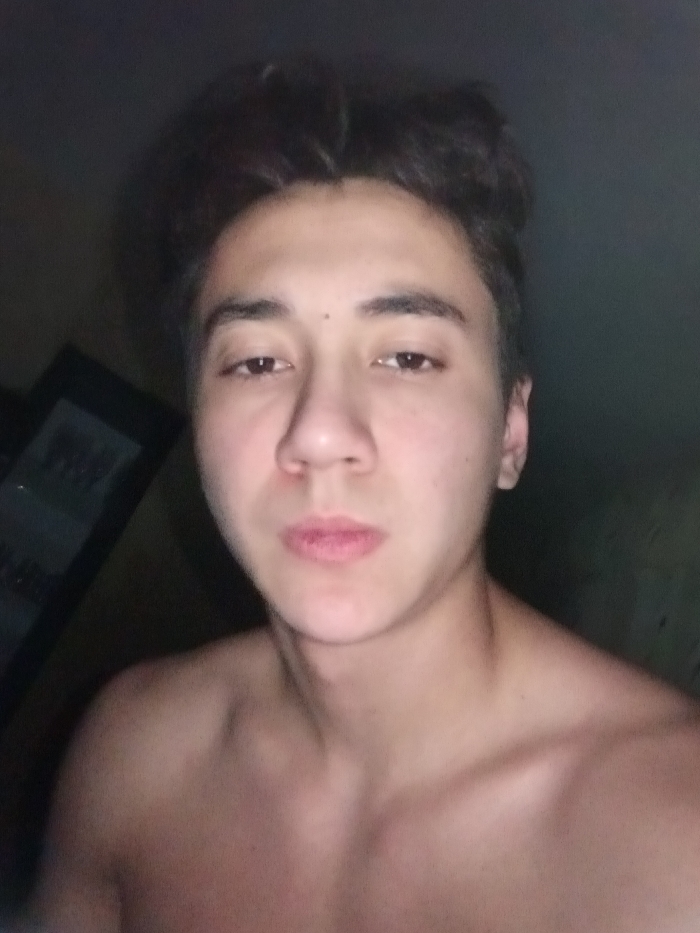A close-up, head-and-shoulders portrait captures a young male individual in an indoor setting within Chaikovsky, Russia. The individual, bare-chested, has dark, textured hair, dark eyes, and a small dark mole on the forehead above his left eye (viewer's right). His lips are slightly parted, presenting a neutral expression. The lighting is dim, contributing to a shallow depth of field that blurs the background. In the upper left background, a dark, rectangular object with indistinct lighter features is partially visible, consistent with a framed item or furniture. The subject looks directly towards the camera. Specific location details within Chaikovsky are not visually discernible.