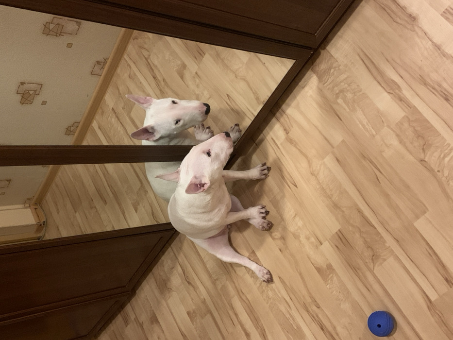 - "A white bull terrier sits on a wood floor, next to a dark wooden cabinet with a mirror" by FM-RWjjF2, licensed under CC BY 4.0