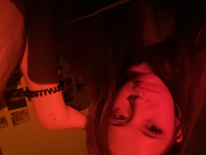 A young female, appearing to be in an indoor setting, is depicted under strong red ambient lighting