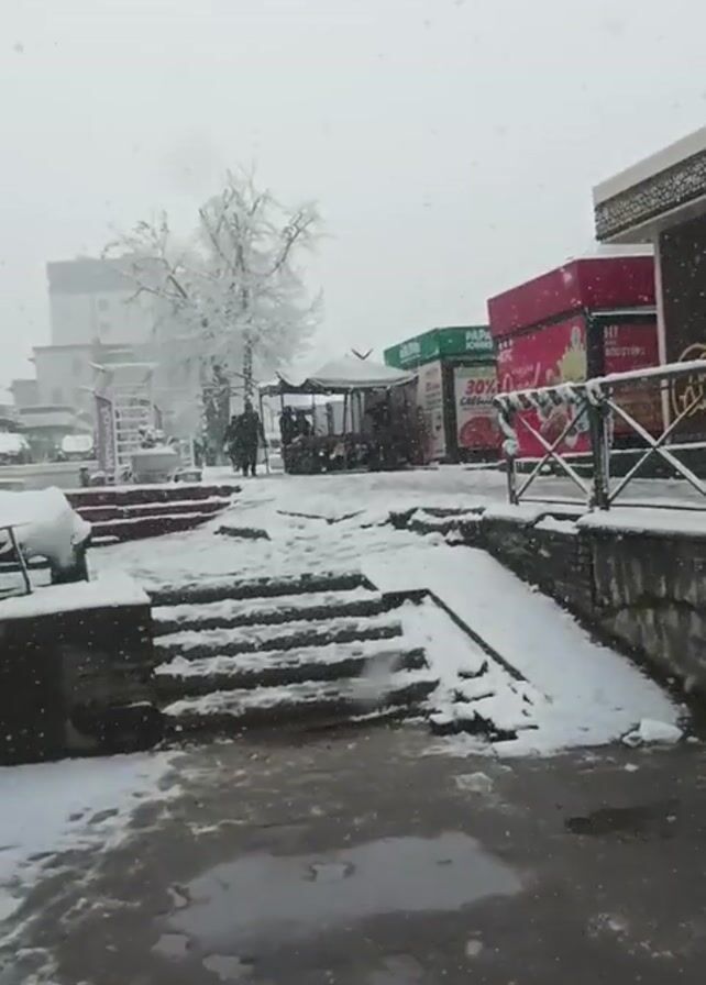 snowy scene in what appears to be a town or city square. Snow is falling, and the ground, steps, and some objects are covered in snow. The visible objects include several food stands, with signs for Papa John's and KFC visible. There are also metal railings, trees, and parts of buildings. Two figures can be seen walking in the distance. The scene is overcast and appears to be captured in the daytime. The ground is wet, and there are some visible puddles of water.
