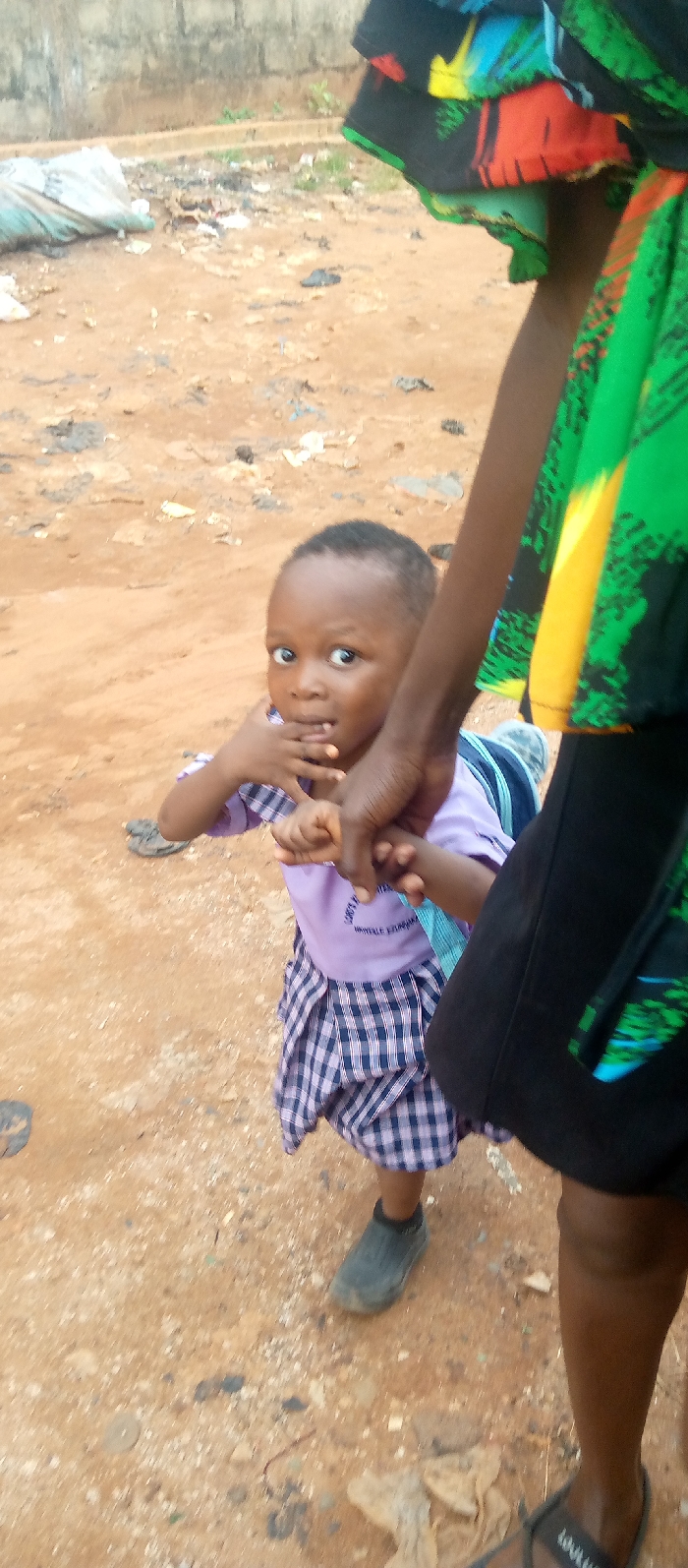 The scene in Ukwu-Abwa, Nigeria, depicts an outdoor, unpaved area with reddish-brown soil and scattered debris, including a discarded white sack on the left and various dark stains and small rocks. A concrete block wall runs horizontally across the background. In the foreground, a young child with dark skin, wearing a light purple shirt, blue and white checkered skirt, and dark shoes, stands center-left. The child faces forward, looking directly at the viewer with wide eyes, and has their right hand partially covering their mouth. The child's left hand is held by the right hand of an adult, whose lower torso, right arm, and right leg are visible on the right side of the frame. The adult wears dark clothing with a brightly patterned fabric (green, yellow, red, blue, black) and a dark sandal on their visible foot. The interaction suggests an adult supervising or accompanying the child.