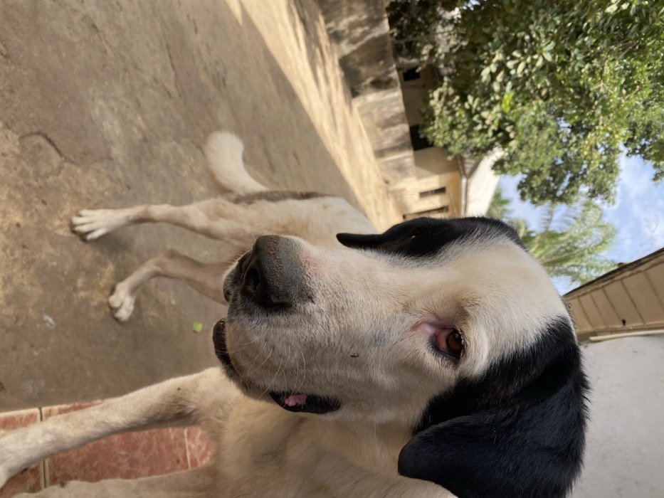 - "A large, white dog with distinct black markings on its head and ears is depicted standing outdoors on a light-colored concrete or paved surface" by FM-v68Gl1, licensed under CC BY 4.0
