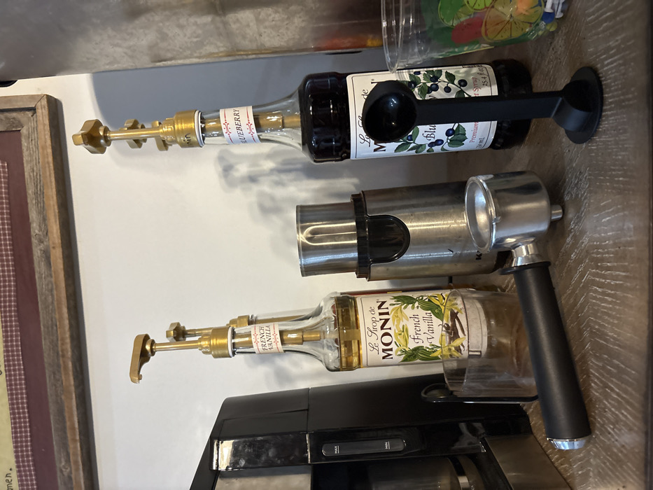 kitchen counter with various items. Two syrup bottles, one labeled "Blueberry" and another "French Vanilla" by Monin, have pumps attached. A stainless steel portafilter and grinder are centrally placed. A black coffee maker is visible in the bottom portion, while a jar with fruit slices is situated at the top edge. A framed picture is visible on the left side. The counter appears to be made of a light-colored wood.