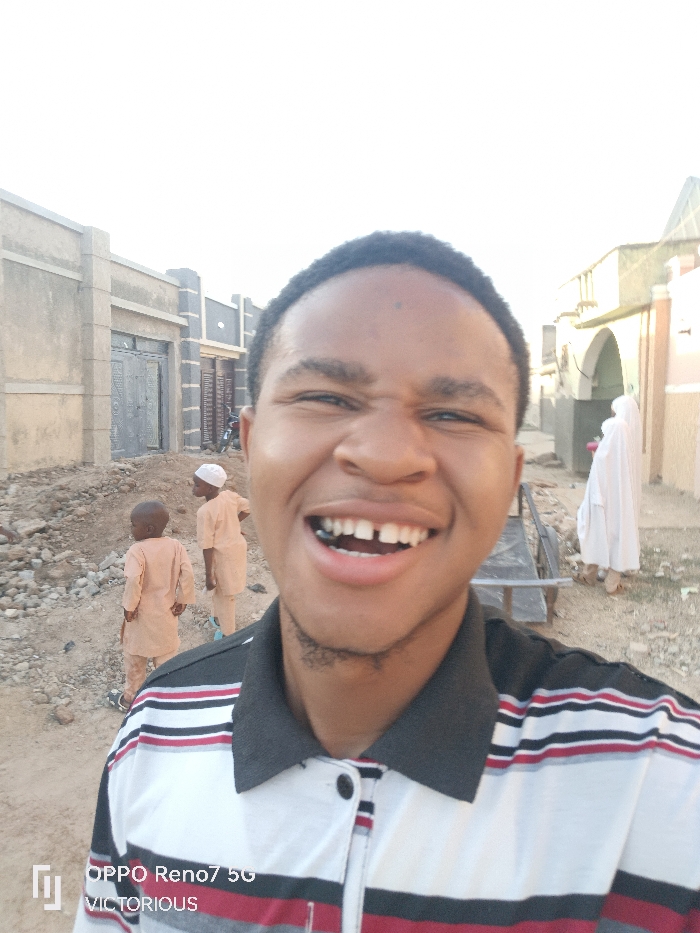 A man smiles broadly at the camera, showcasing a gap between his front teeth. He wears a collared shirt with white, black, and red horizontal stripes. Behind him, two young boys in matching tan outfits and a woman in a long white robe walk along a dusty street. Simple buildings line the street, some with gated entrances. A wheelbarrow sits nearby. The scene appears to be outdoors, during daylight, possibly in a village or small town. Text at the bottom of the image includes the words "OPPO Reno7 5G" and "VICTORIOUS."