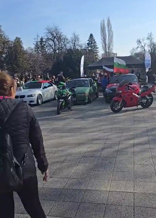 crowd of people gathered in a large public square on a sunny day. There are several cars and motorcycles on display, including a white BMW with red, white, and green stripes, a green BMW, a red Honda motorcycle, and a green Kawasaki motorcycle. Some people are waving Bulgarian flags. A large building with a dome is visible in the background. People are walking around, taking pictures, and talking to each other. The ground is paved with light gray tiles. The atmosphere appears festive.