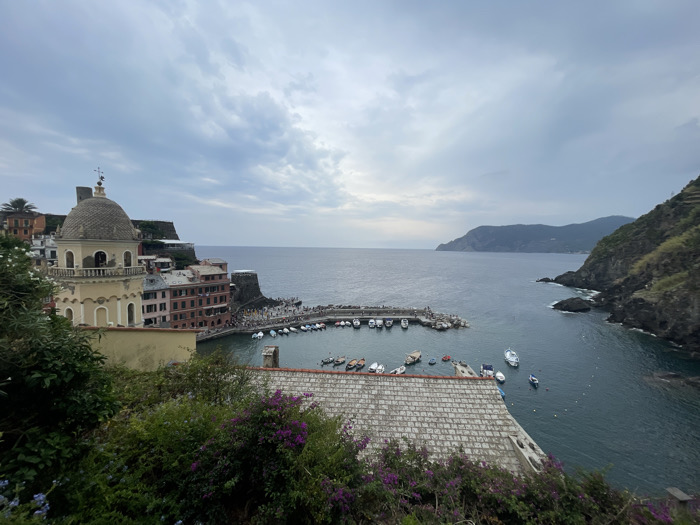 The image displays a high-angle view of the harbor and coastal area of Vernazza, Italy. In the mid-ground, on the left, the octagonal bell tower of the Church of Santa Margherita d'Antiochia, featuring a dome and spire, is prominent, flanked by multi-story, pastel-toned residential buildings. A stone pier extends from the built-up area into the harbor basin. Numerous small, mostly white, boats are moored along the pier and at anchor within the harbor. Multiple individuals are visible on the pier, consistent with pedestrian activity. To the right, the rugged, dark rocky coastline and steep, vegetated hillsides descend into the Ligurian Sea. The sea extends to the horizon under an overcast sky, with a distant headland visible on the far right. The immediate foreground features dense green foliage, including bushes with purple flowers, and a section of a tiled rooftop.