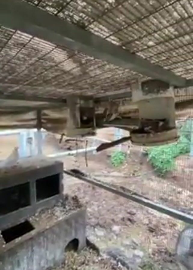 The camera pans up and across the scene in this medium shot. We are under a corrugated metal roof, covered by metal mesh. There are a number of concrete objects with metal supports. One is a tiered feeder or birdhouse, and a bird is nesting on its lower tier. The ground is exposed dirt and patchy growth. A metal fence is visible around the enclosure. A male voice is talking in the background.